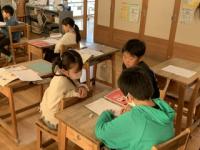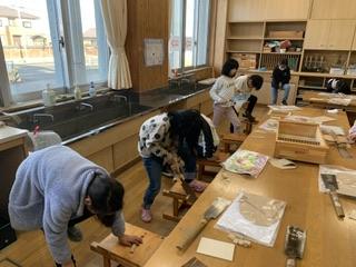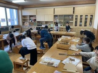 4年生は図工「ギコギコ トントン クリエイター」の学習で、のこぎりを使って木を切り、コルクボードやカレンダー板を作っています。のこぎりの持ち方や置き方など、常に安全を確認し、友達と助け合いながら活動しています。完成した作品が楽しみです。