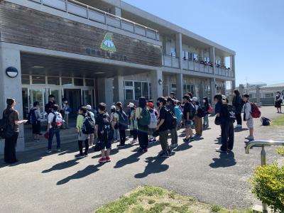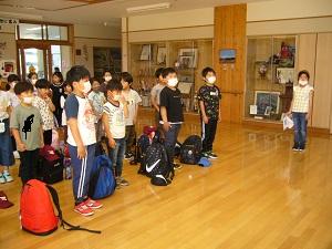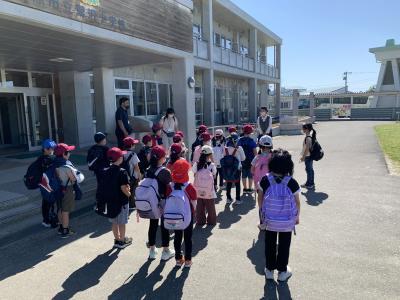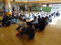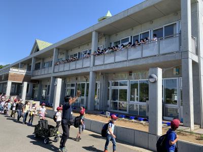 5月31日(水)朝,晴天の下,1~4年生が遠足に出発しました。みんな出席し,元気です。5.6年生がベランダからお見送りしてくれました。
