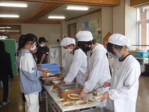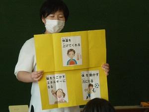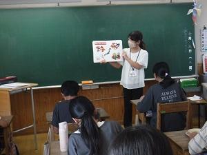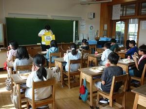 10月5日(木)に栗原市給食センターの方においでいただき、4,5,6年生児童に給食指導がありました。4年生は黄色の食品(熱や力になる食品)、ごはん・パン・イモ類についてのお話でした。5年生は「骨にカルシウム貯金をしましょう。成長期にカルシウムを積極的にとりましょう。」というお話でした。6年生は季節の食事について(一汁三菜や行事食)のお話でした。子供たちは給食を食べながらも耳と目はしっかりと先生の方を向いてお話を聞いていました。