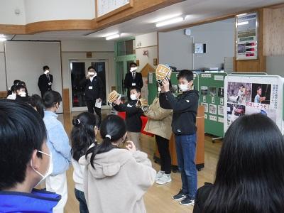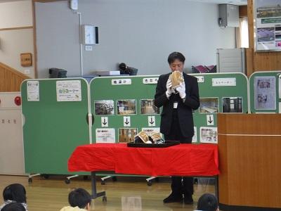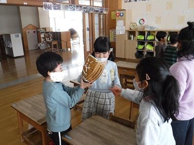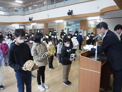 1月16日(火)に本校にも大谷選手のグローブが届きました。早速全校集会を開き、子供たちにグローブを披露しました。校長先生が大谷選手のメッセージ「私はこのグローブが、私たちの次の世代に夢を与え、勇気づけるためのシンボルとなることを望んでいます。それは、野球こそが私が充実した人生を送る機会を与えてくれたからです。野球しようぜ!。」を紹介した後に、「大谷選手のように目標に向かって努力を続ける気持ちを持ちましょう。」とお話しました。その後、代表の子供3人がグローブを校長先生から受け取りました。教室に戻って全員がじっくり見たり、触ったりしました。今後体育や休み時間などで活用していきたいと思います。