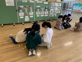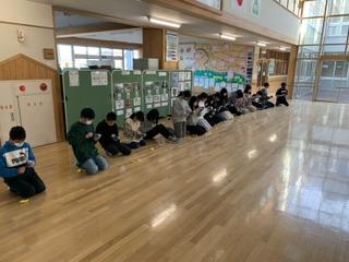 1月11日(木)に6年生が理科の「電気と私たちのくらし」の学習をしていました。この日はホールに集まり、手回し発電機の実験キットを使って実験。20秒手回し発電機を回し、どこまでキットが進むかなどを確かめていました。